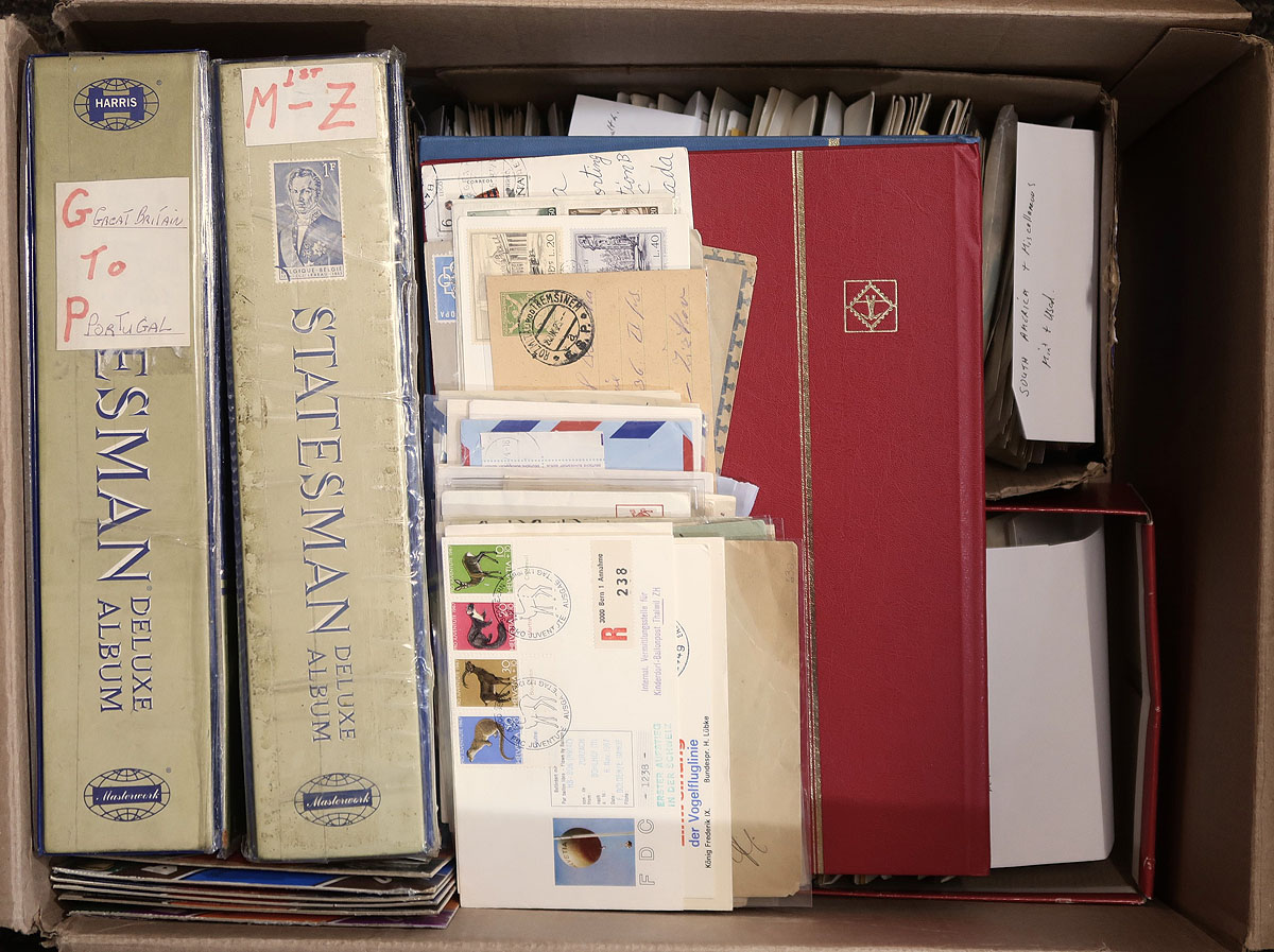 A philatelic potpourri box-lot. A interesting an useful sorting project, which includes two shoeboxes filed with stamps sorted by country / region / continent etc, two "Statesmen" albums containing several hundred stamps from "G to P" and then "M to Z", two 16-page stockbooks (one used Canada / the other mint and used worldwide), a bundle of about 50 mostly European covers and several packages / pages / loose items. A wonderful winter project, with many thousands of stamps. Estimate =