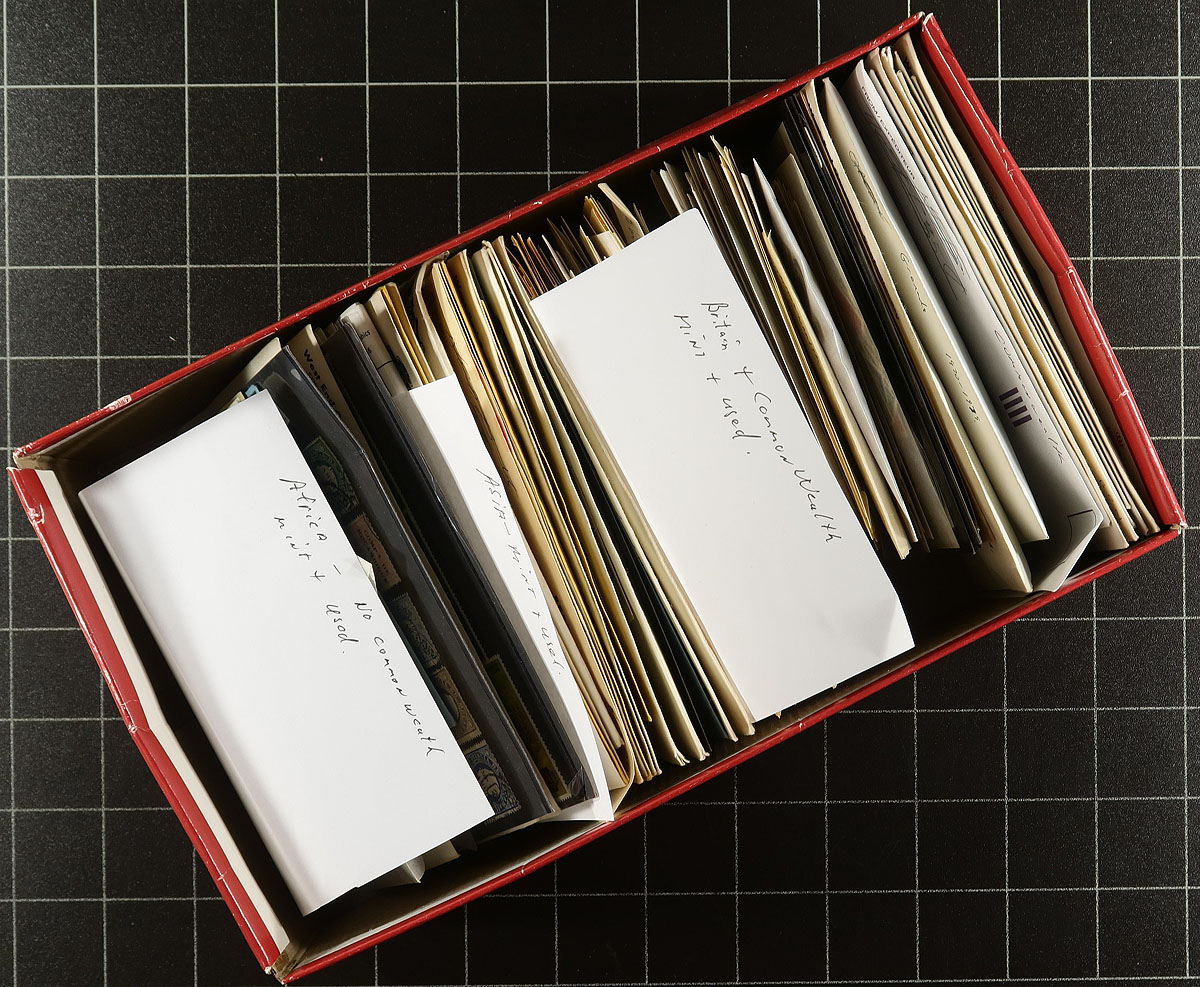 A philatelic potpourri box-lot. A interesting an useful sorting project, which includes two shoeboxes filed with stamps sorted by country / region / continent etc, two "Statesmen" albums containing several hundred stamps from "G to P" and then "M to Z", two 16-page stockbooks (one used Canada / the other mint and used worldwide), a bundle of about 50 mostly European covers and several packages / pages / loose items. A wonderful winter project, with many thousands of stamps. Estimate =