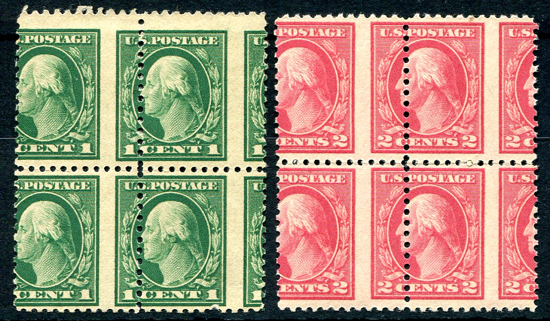 Attractive duo of misperf / error blocks of the 1c green / 2c carmine Washington issues. The 1c block with natural gum skip at top, otherwise Never Hinged, the 2c block Never Hinged with full unblemished gum. Wonderful plus-value additions to any collection. Similar blocks offered online are priced at $150-250 each! Estimate =