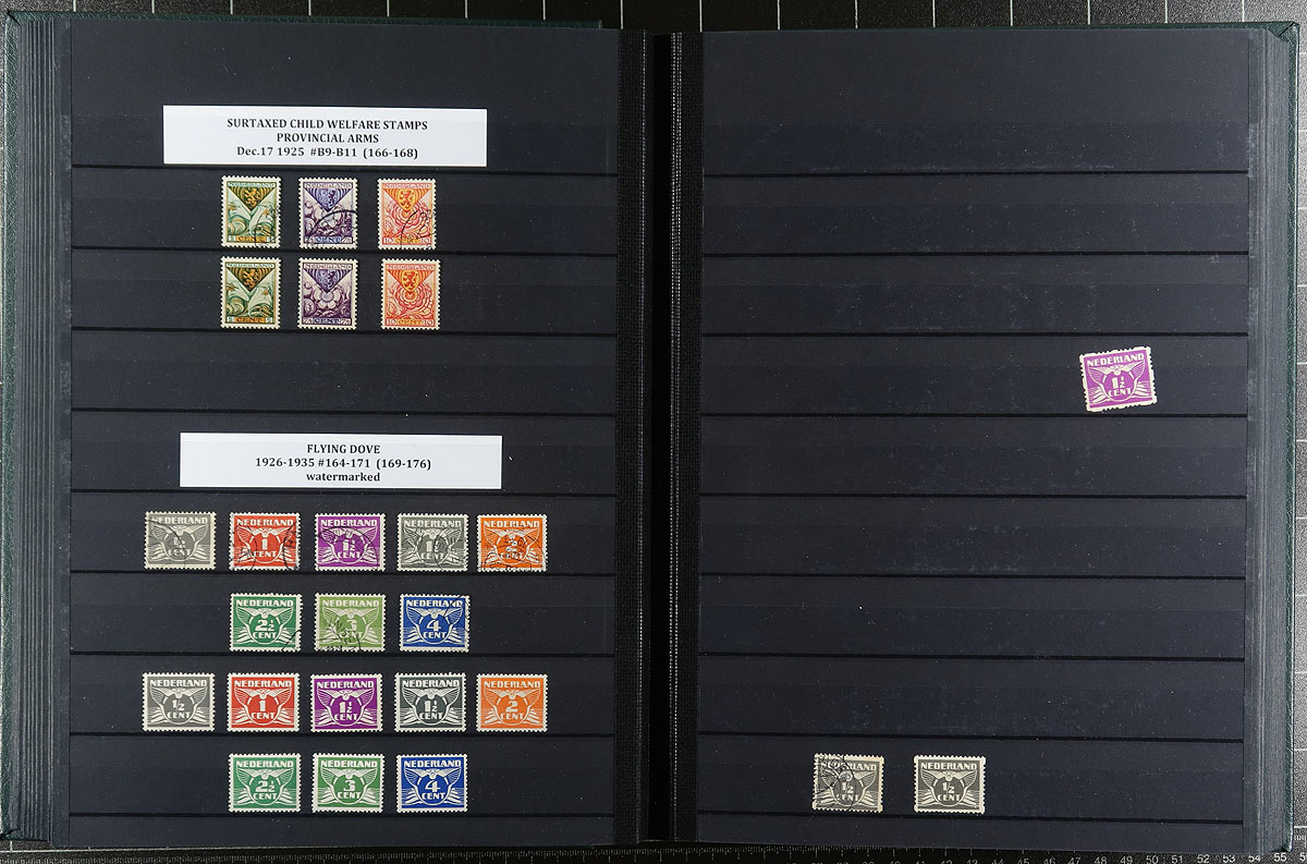 Remaindered (but still meaty) 1919 to 1947 period high quality collection, all neatly organized in a top-of-the-line black (all acetate) 64-page Lighthouse brand stockbook with matching dark green slipcase. The lot includes definitive, commemorative, airmail and semi-postal sets and singles, often with mint and used examples of each stamp. Take a good look at the scans, as many of the sets are neatly identified. Includes mint #278-81, many very good semi-postals, #C1 through C10, etc. Estimate =