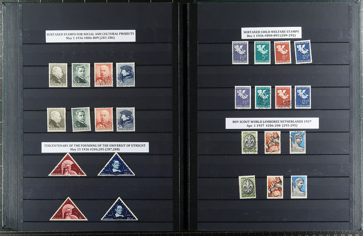 Remaindered (but still meaty) 1919 to 1947 period high quality collection, all neatly organized in a top-of-the-line black (all acetate) 64-page Lighthouse brand stockbook with matching dark green slipcase. The lot includes definitive, commemorative, airmail and semi-postal sets and singles, often with mint and used examples of each stamp. Take a good look at the scans, as many of the sets are neatly identified. Includes mint #278-81, many very good semi-postals, #C1 through C10, etc. Estimate =