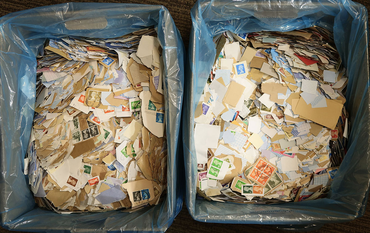 Two U-Haul boxes filled with Machins on paper, making for approximately 30 pounds (13 kg) with thousands of stamps. As received from a range of charity sources over a significant length of time. This has resulted in diversity (it probably goes back to the pre-decimal period and up to about 2010), and a touch of "other material", mostly British or regional issues, but also saw a few worldwide stamps (for the record). This is an opportunity to dig for the many varied and short-lived printings of the world’s longest continually running philatelic issue. Colourful! Estimate =