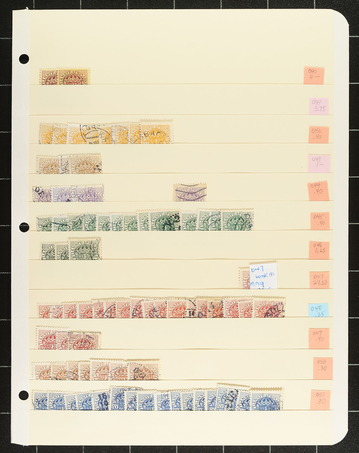 An eight-page accumulation of used "Back of the Book", with semi postals (#B16-B17), Airmail #C1-C3 (x2), #C8c (x8) and Officials #O1-O4, #O7, #O10, #O11, #O21, #O23. In quantities of up to about 8 of a type, all neatly arranged and identified by Scott. The indicated catalogue values are mostly current, meaning that there is roughly US$2000.00 catalogue value by the 2024 Scott. Condition is strong, with some nice cancels poking out here and there. Estimate =