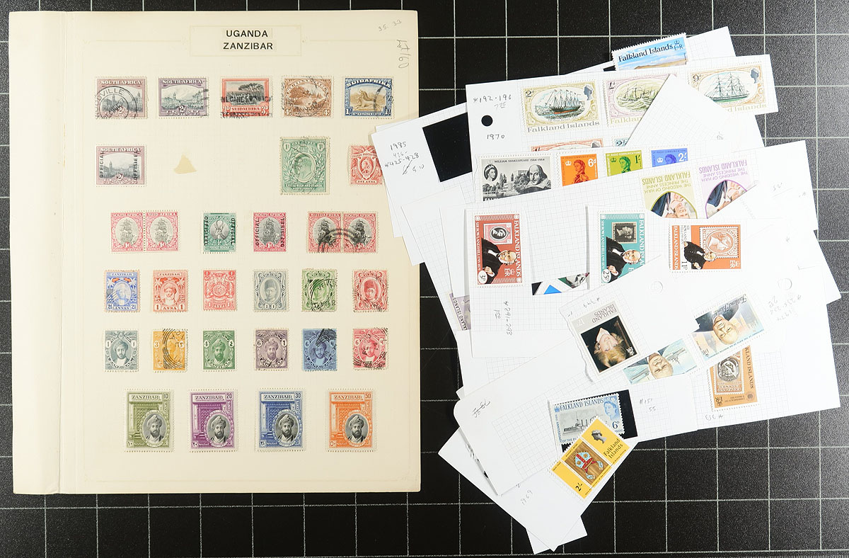 Mostly British Atlantic material, with a touch of Africa. A series of bid board lots, dealer offerings, album fragments etc. Mint, used, classic-era to the 1980’s, with a touch of duplication. We saw lots of Falkland Islands (with some "Dependencies"), St. Helena, British Guiana, Guyana and three pages with South Africa, Rhodesia, Zanzibar. A surprising amount of this was catalogued at one time, which will add up to several hundred dollars by Scott. Estimate =