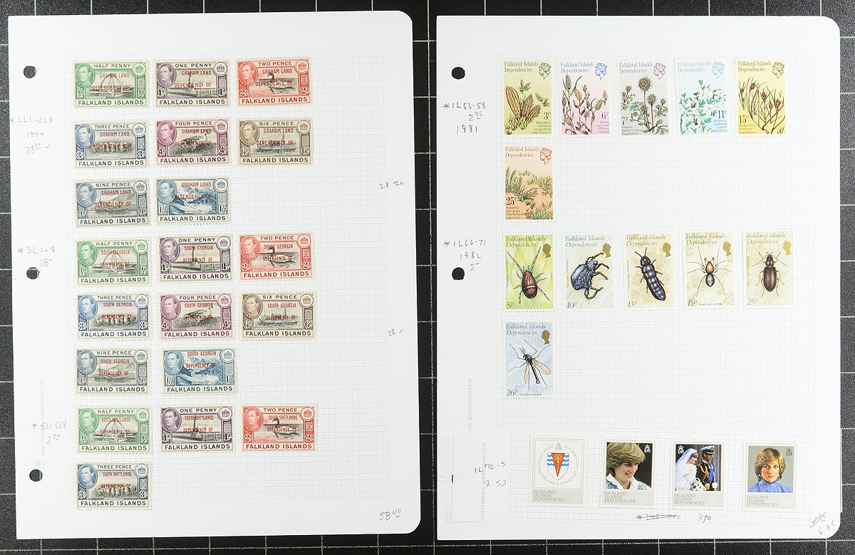 Mostly British Atlantic material, with a touch of Africa. A series of bid board lots, dealer offerings, album fragments etc. Mint, used, classic-era to the 1980’s, with a touch of duplication. We saw lots of Falkland Islands (with some "Dependencies"), St. Helena, British Guiana, Guyana and three pages with South Africa, Rhodesia, Zanzibar. A surprising amount of this was catalogued at one time, which will add up to several hundred dollars by Scott. Estimate =