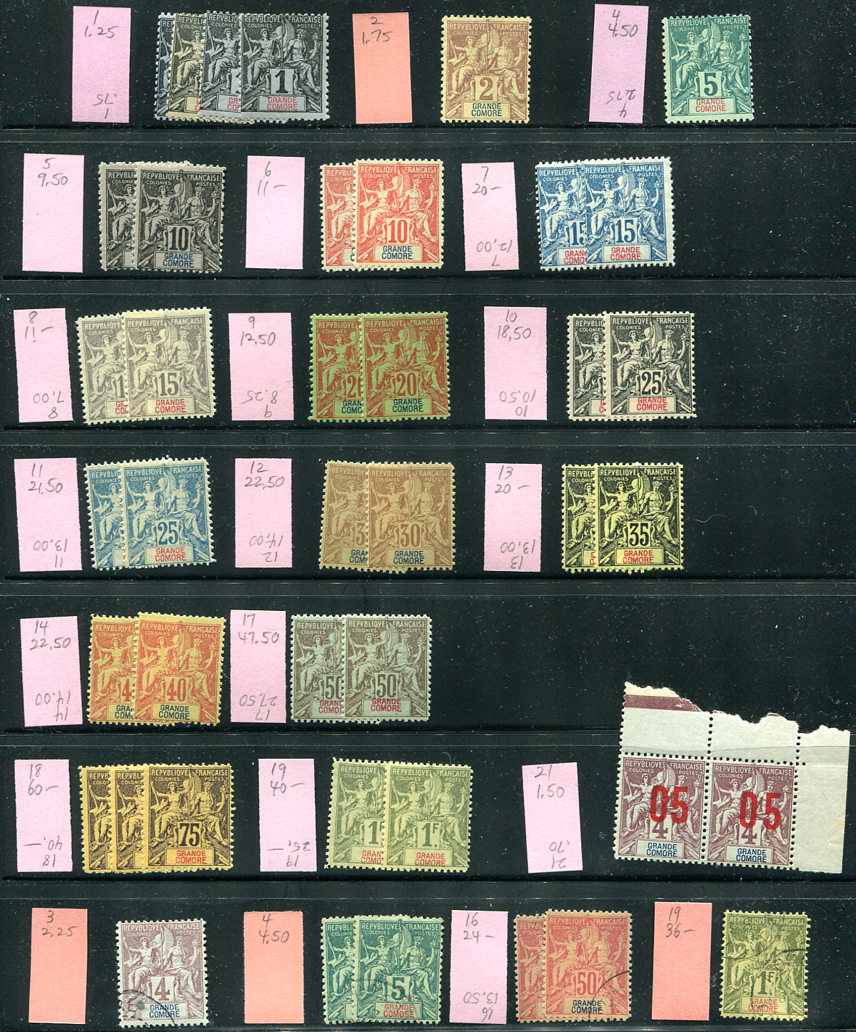 The balance of a holding from this French African colony that we have been breaking up. All "Navigation and Commerce" designs, mostly mint (in quantities of 1-3 stamps each) with only a couple missing, plus a pair of one of the revalued issues. Most are mint with nice gum; there is a small group of six used examples at the bottom of the page. 2024 Scott US$832.60 =