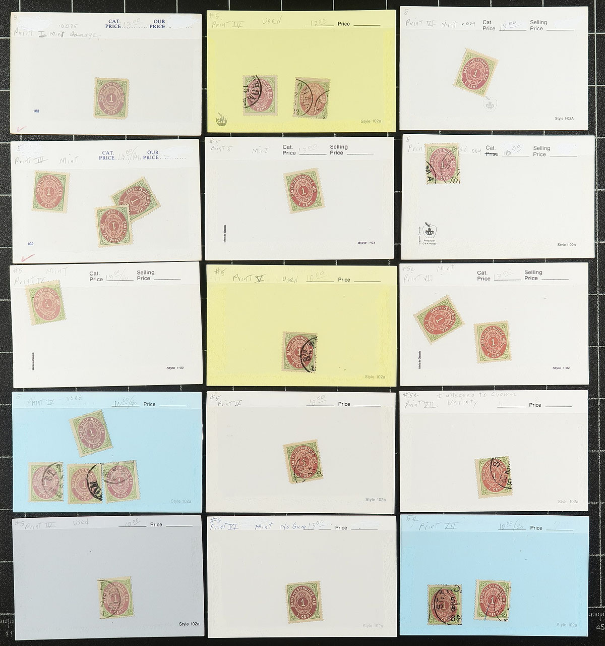 An older accumulation of mint and used 1870’s "Numeral" issues on "102" cards, with values from 1c to 12c. Indication of various printing types by roman numerals (Facit?). About 100 stamps in total with up to about 40 of a denomination, but between mint and used and the various printings, there tends not to be more than 5 of a type. Includes individual stamps with catalogue values up to $50.00 (a couple of higher values are damaged and not considered). Condition is a bit mixed. The prices are from the 1980’s, which we estimate to be about US$3000.00 catalogue value. Estimate =