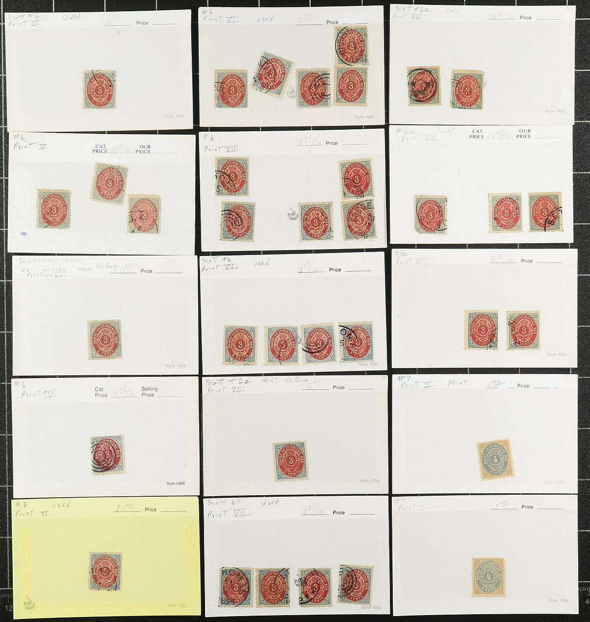 An older accumulation of mint and used 1870’s "Numeral" issues on "102" cards, with values from 1c to 12c. Indication of various printing types by roman numerals (Facit?). About 100 stamps in total with up to about 40 of a denomination, but between mint and used and the various printings, there tends not to be more than 5 of a type. Includes individual stamps with catalogue values up to $50.00 (a couple of higher values are damaged and not considered). Condition is a bit mixed. The prices are from the 1980’s, which we estimate to be about US$3000.00 catalogue value. Estimate =