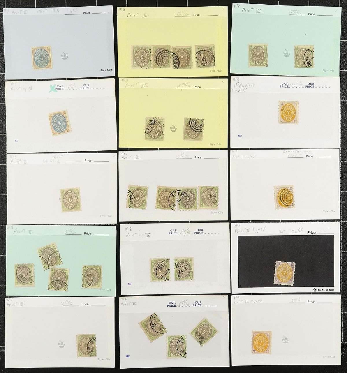An older accumulation of mint and used 1870’s "Numeral" issues on "102" cards, with values from 1c to 12c. Indication of various printing types by roman numerals (Facit?). About 100 stamps in total with up to about 40 of a denomination, but between mint and used and the various printings, there tends not to be more than 5 of a type. Includes individual stamps with catalogue values up to $50.00 (a couple of higher values are damaged and not considered). Condition is a bit mixed. The prices are from the 1980’s, which we estimate to be about US$3000.00 catalogue value. Estimate =