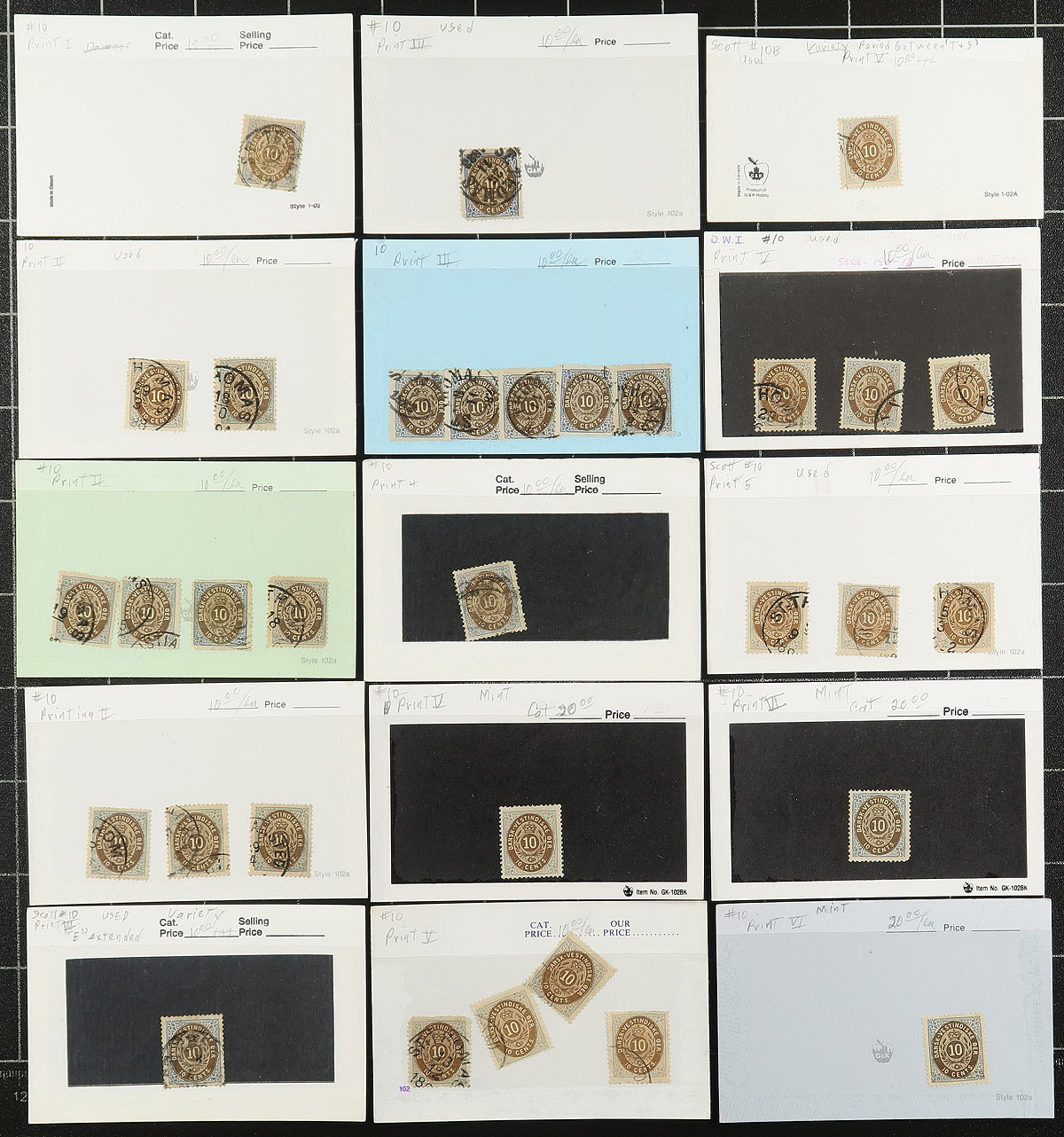 An older accumulation of mint and used 1870’s "Numeral" issues on "102" cards, with values from 1c to 12c. Indication of various printing types by roman numerals (Facit?). About 100 stamps in total with up to about 40 of a denomination, but between mint and used and the various printings, there tends not to be more than 5 of a type. Includes individual stamps with catalogue values up to $50.00 (a couple of higher values are damaged and not considered). Condition is a bit mixed. The prices are from the 1980’s, which we estimate to be about US$3000.00 catalogue value. Estimate =
