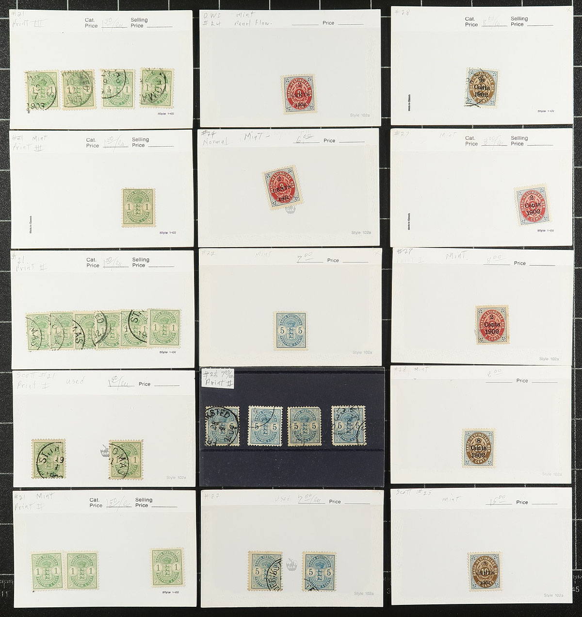 An older accumulation of mint and used from the 50c high value of the 1870’s "Numeral" issues up to the Christian X issue of 1918, before being sold to the United States. All on "102" cards, with high values, overprints, numerals, various Kings definitives. Indication of various printing types by roman numerals (Facit?). About 100 stamps in total with up to about 15 of a denomination, but between mint and used and the various printings, there tends not to be more than 5 of a type. Includes individual stamps with catalogue values up to $250.00. Condition is a bit mixed. The prices are from the 1980’s, we estimate about US$1750.00 catalogue value. Estimate =