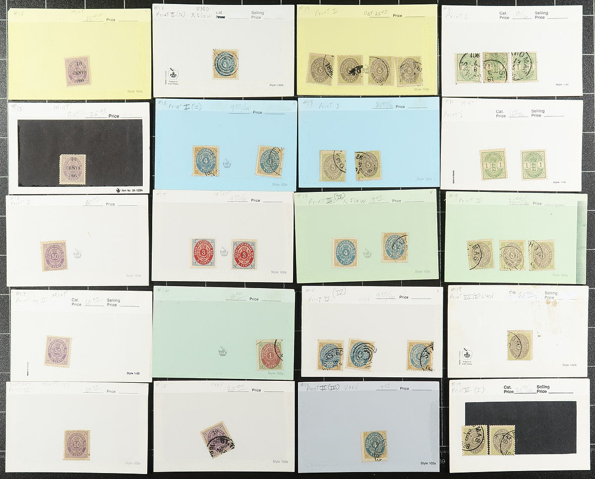 An older accumulation of mint and used from the 50c high value of the 1870’s "Numeral" issues up to the Christian X issue of 1918, before being sold to the United States. All on "102" cards, with high values, overprints, numerals, various Kings definitives. Indication of various printing types by roman numerals (Facit?). About 100 stamps in total with up to about 15 of a denomination, but between mint and used and the various printings, there tends not to be more than 5 of a type. Includes individual stamps with catalogue values up to $250.00. Condition is a bit mixed. The prices are from the 1980’s, we estimate about US$1750.00 catalogue value. Estimate =