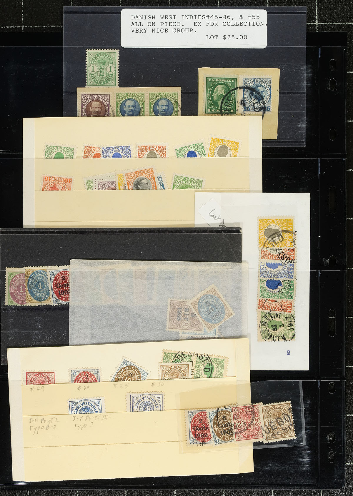 A leftover group of working material that this collector never got around to organizing. Includes better 1870’s numerals, some overprints (including #14), cancels, several bisects on piece (FDR collection), a mint example of #20 with a 1990 certificate, a used copy of #37 and a mint and used example of #38. It won’t take much to whip this lot into shape. Estimate =