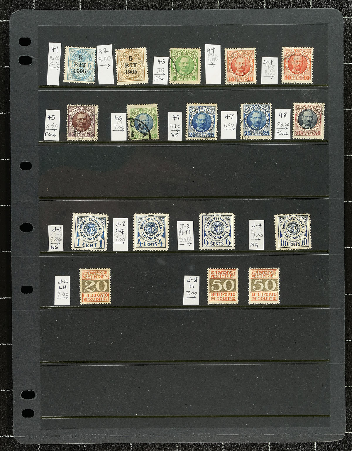 A half dozen stockpages and a couple of mounted groups with more used than mint, which appeared to be this collector’s group of material in transit from purchase to collection or stock. We noted a copy of #11, with some overprints right up to the Christian X issue during the Great War. Condition is definitely mixed, but understanding this lot will make you a much more knowledgeable collector of this Caribbean colony. Estimate =