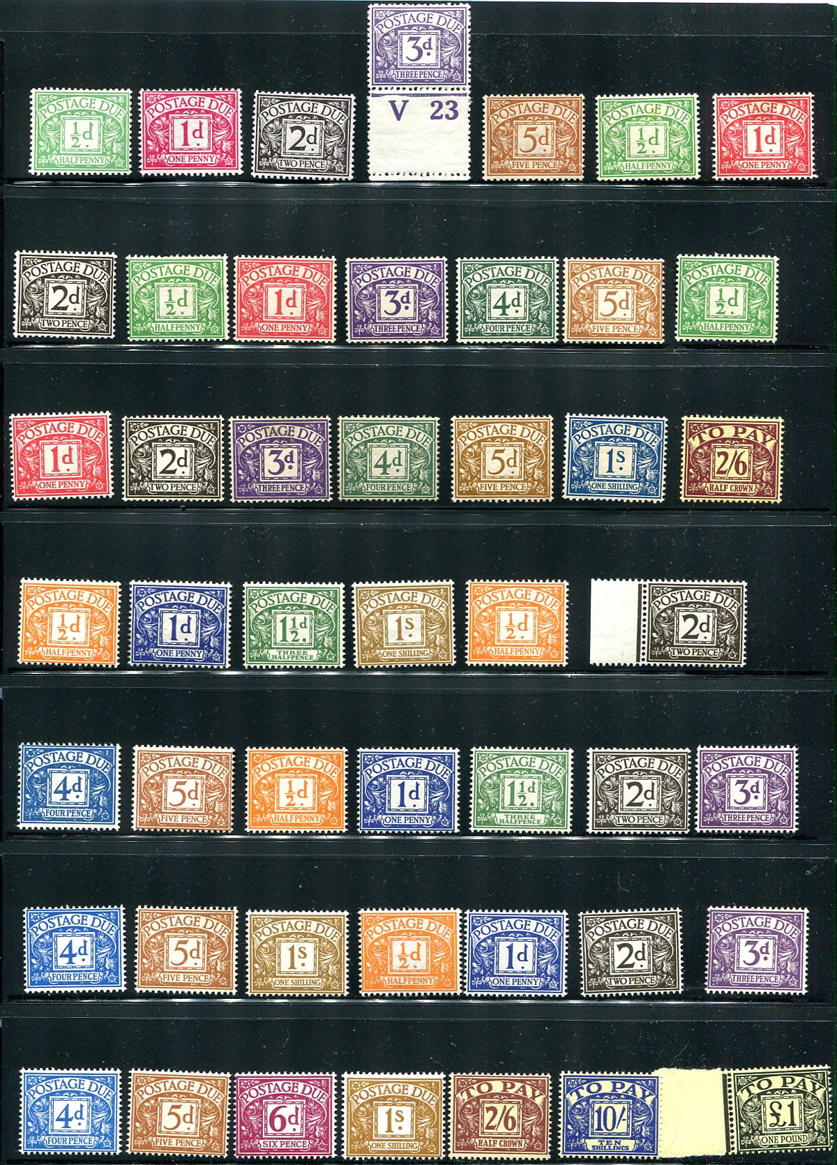 Extensive and all different mint postage due offering, with good representation from all issues and a few complete sets. Fresh with the earlier being hinged (a couple might have remnants), the middle period are lightly hinged and the more modern are mostly never hinged. Face values to £5. Better individual singles includes #J30, #J33, #J38, #J40, #J48. 2024 Scott US$657.70 =