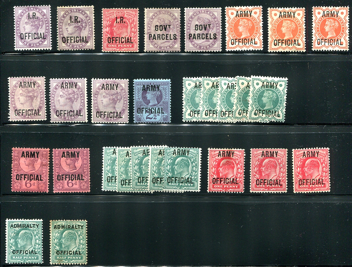 Small accumulation of official overprints from various departments on Queen Victoria and King Edward VII stamps. Inland Revenue (#O4, #O20), Government Parcels (#O37 x2), Army Official (#O56, #O58 x2) and "Admiralty Official (#O72 and #O78 - a bit stained, the only visible damage seen in this lot. The overprints look good, but use a critical eye when inspecting. All mint, with typical hinging for the era (which includes a few with minor remnants). 2024 Scott US$840.00 =