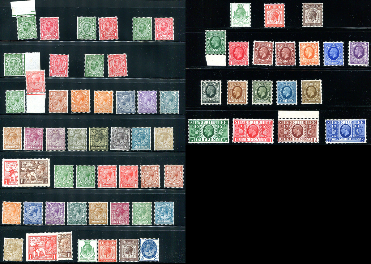The start of a specialized collection of mint King George V sets and singles, with most of the basic issues for this period (sorry, no Seahorses or PUC "Pounds"). Includes the technically difficult 1/2d and 1d issues of 1911-12, plus some Scott-listed shades, and a few with "sideways watermark" including #205a-#207a, the 1929 PUC trio, cat $225.00). Both printings of the British Empire Exhibition and the Silver Jubilee issues are also here. Clean mint appearance and most are lightly hinged. 2024 Scott US$961.80 =