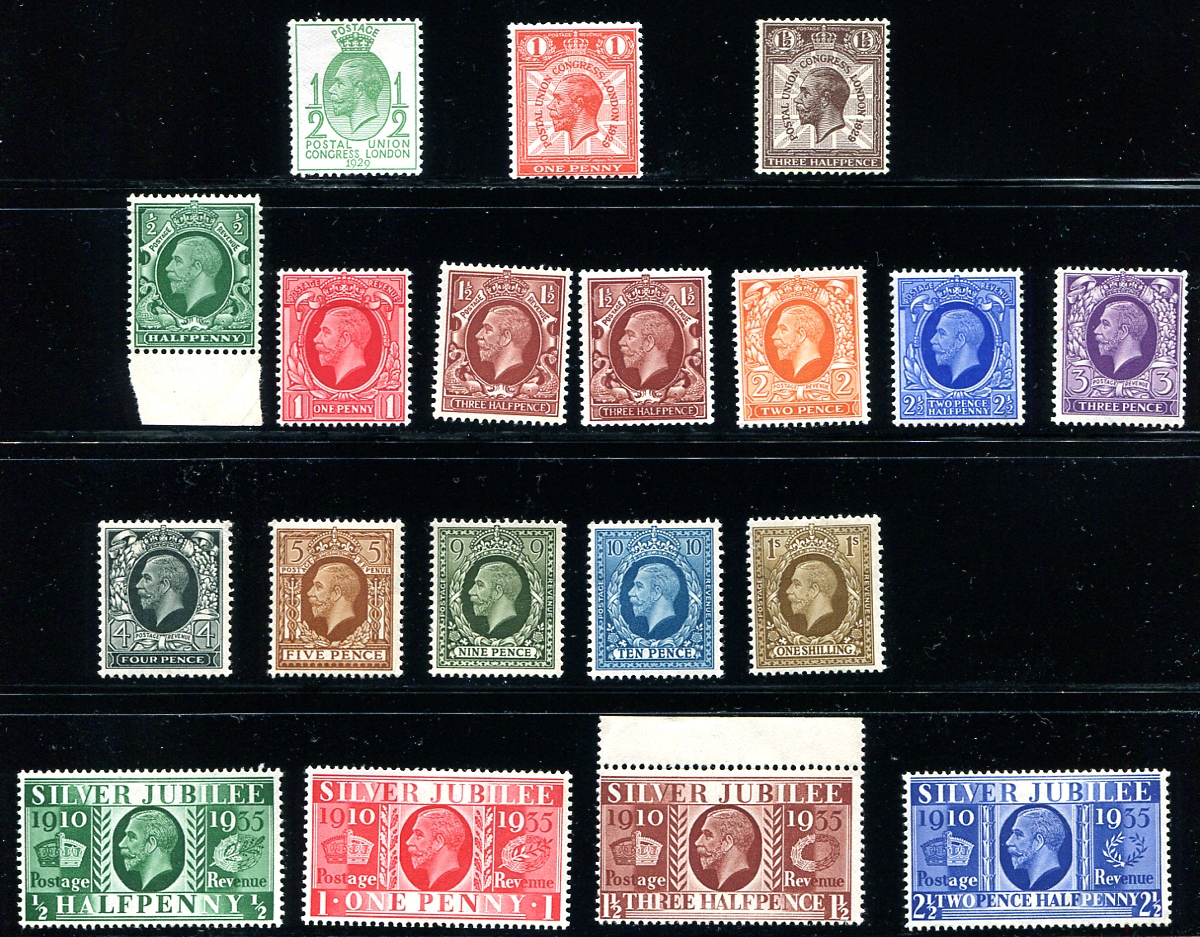 The start of a specialized collection of mint King George V sets and singles, with most of the basic issues for this period (sorry, no Seahorses or PUC "Pounds"). Includes the technically difficult 1/2d and 1d issues of 1911-12, plus some Scott-listed shades, and a few with "sideways watermark" including #205a-#207a, the 1929 PUC trio, cat $225.00). Both printings of the British Empire Exhibition and the Silver Jubilee issues are also here. Clean mint appearance and most are lightly hinged. 2024 Scott US$961.80 =