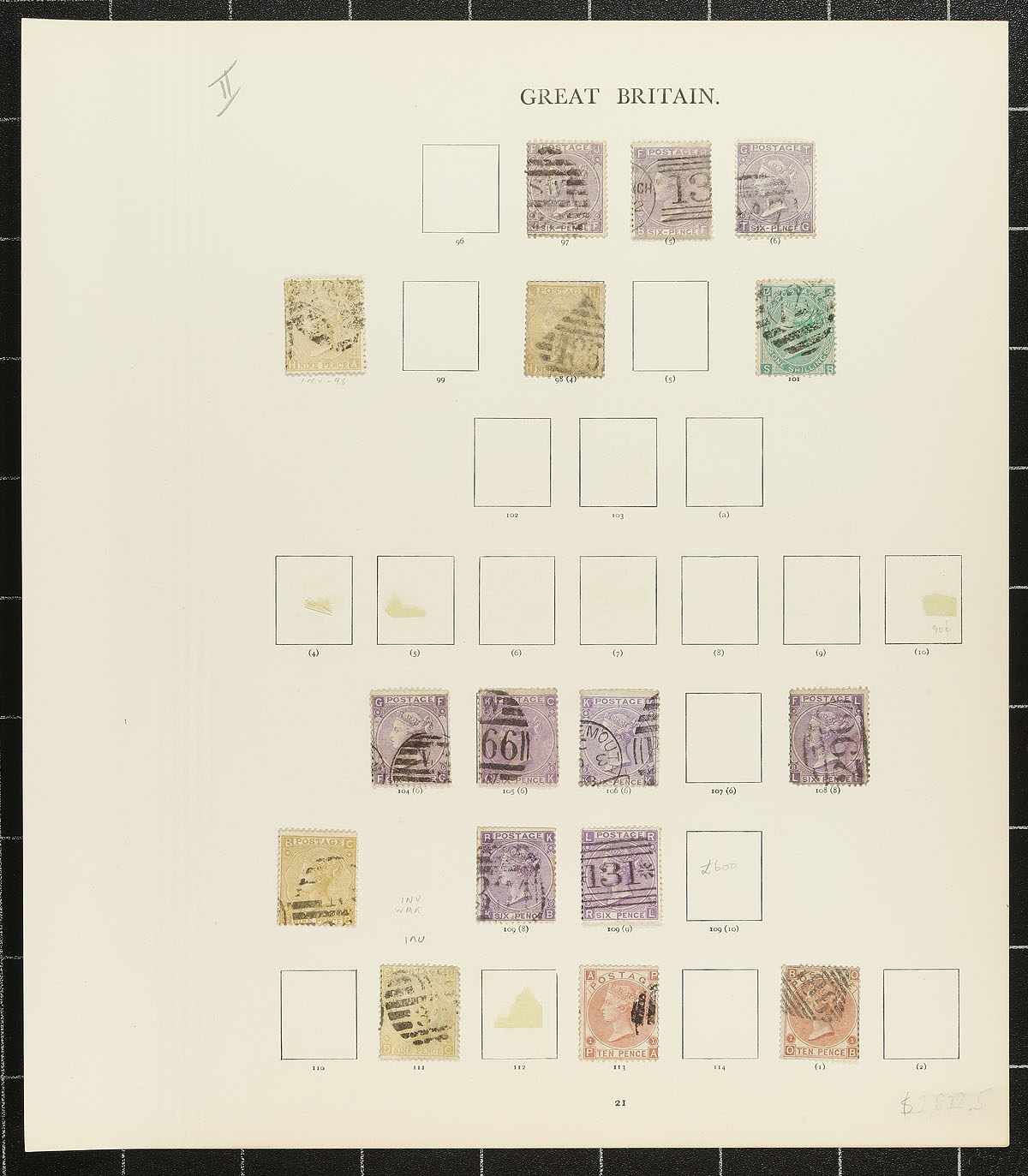 Windsor album remnant part 2 (#45/66): Mid Queen Victoria era, covering 1867-1875. Lots of attractive and often high catalogue value stamps, noting two copies of Scott #53. Lots of shades, some beautiful cancels and a couple have notations about inverted watermarks, so more exploration is still possible here. Condition is a bit mixed, as is normal for this period. A couple of obviously damaged or dubious have not been counted. A used collection from a local estate who collected by Stanley Gibbons (the accuracy has not been verified by us). We estimate the current Scott catalogue value to be around $3000.00. Estimate =