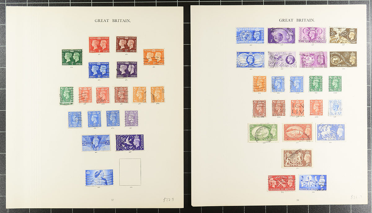 Windsor album remnant part 3 (#88/291 plus Postage Dues): Late Queen Victoria era to the end of the King George VI period. Lots of attractive and often high catalogue value stamps, noting the 1887 Jubilee issue, the KEVII issue to 2/6, a large herd of 2/6 and 5/- "Seahorses". Lots of shades, some beautiful cancels. Condition is a bit mixed, as is normal for this period. A couple of obviously damaged or dubious have not been counted. A used collection from a local estate who collected by Stanley Gibbons (the accuracy has not been verified by us). We estimate the current Scott catalogue value to be around $2500.00. Estimate =