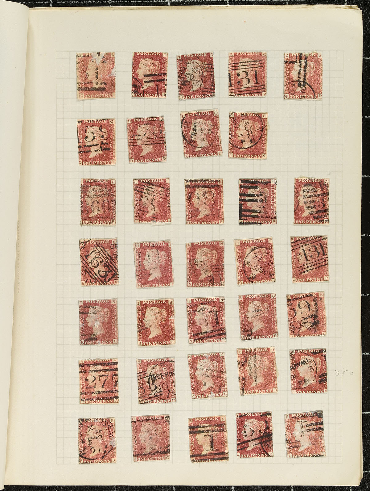 Six-page plate study of the 1864 "Penny Red" with plates up to 222, missing only a few. Comes with "bonus" material of an extra Windsor "page 5" with some overlap, plus a few earlier perforated 1d red and 2d blue. The other bonus is an old #33 plate study with about 350 stamps, which alas many were removed with scissors, but there could be some worthwhile survivors here. Estimate =