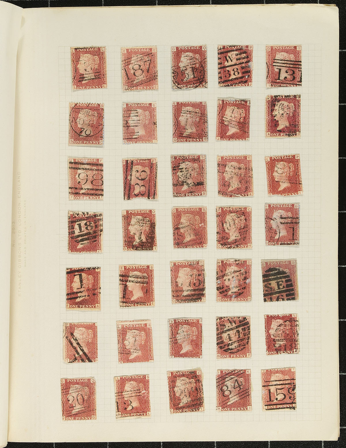 Six-page plate study of the 1864 "Penny Red" with plates up to 222, missing only a few. Comes with "bonus" material of an extra Windsor "page 5" with some overlap, plus a few earlier perforated 1d red and 2d blue. The other bonus is an old #33 plate study with about 350 stamps, which alas many were removed with scissors, but there could be some worthwhile survivors here. Estimate =