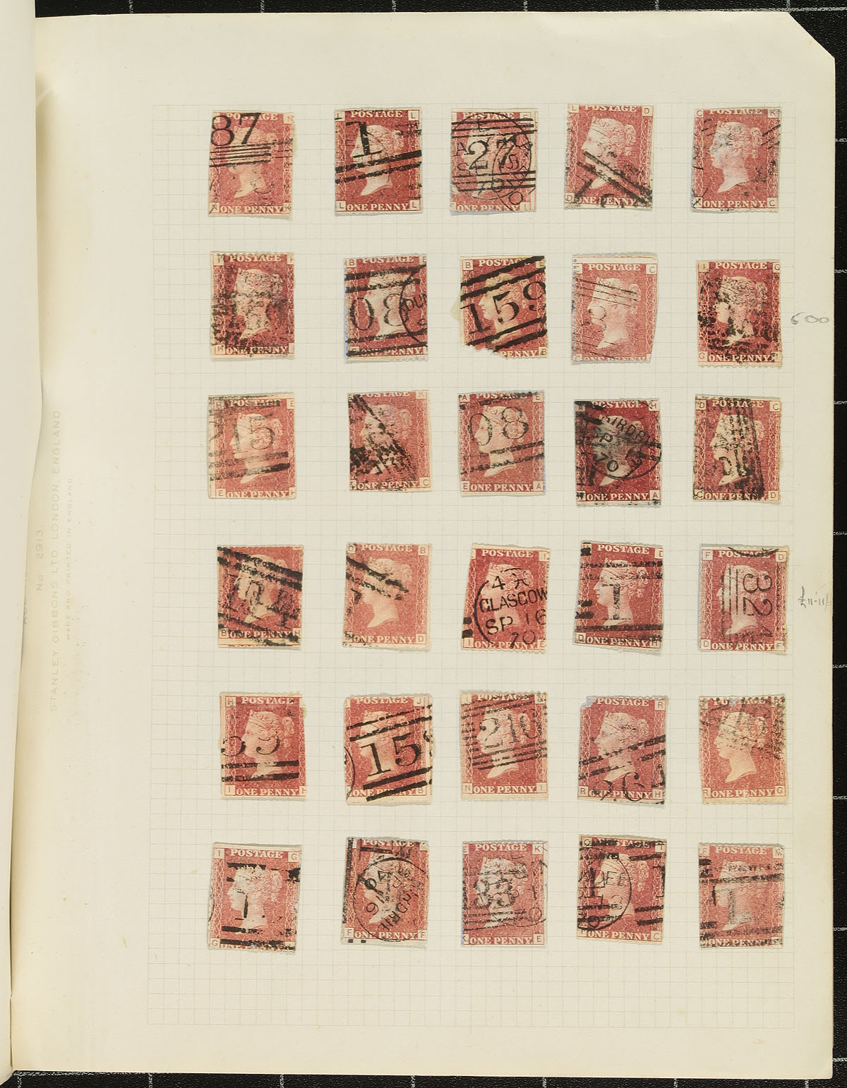 Six-page plate study of the 1864 "Penny Red" with plates up to 222, missing only a few. Comes with "bonus" material of an extra Windsor "page 5" with some overlap, plus a few earlier perforated 1d red and 2d blue. The other bonus is an old #33 plate study with about 350 stamps, which alas many were removed with scissors, but there could be some worthwhile survivors here. Estimate =