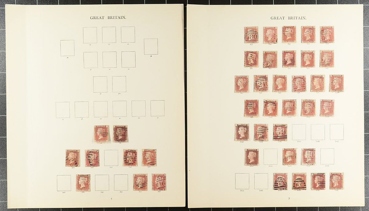 Six-page plate study of the 1864 "Penny Red" with plates up to 222, missing only a few. Comes with "bonus" material of an extra Windsor "page 5" with some overlap, plus a few earlier perforated 1d red and 2d blue. The other bonus is an old #33 plate study with about 350 stamps, which alas many were removed with scissors, but there could be some worthwhile survivors here. Estimate =