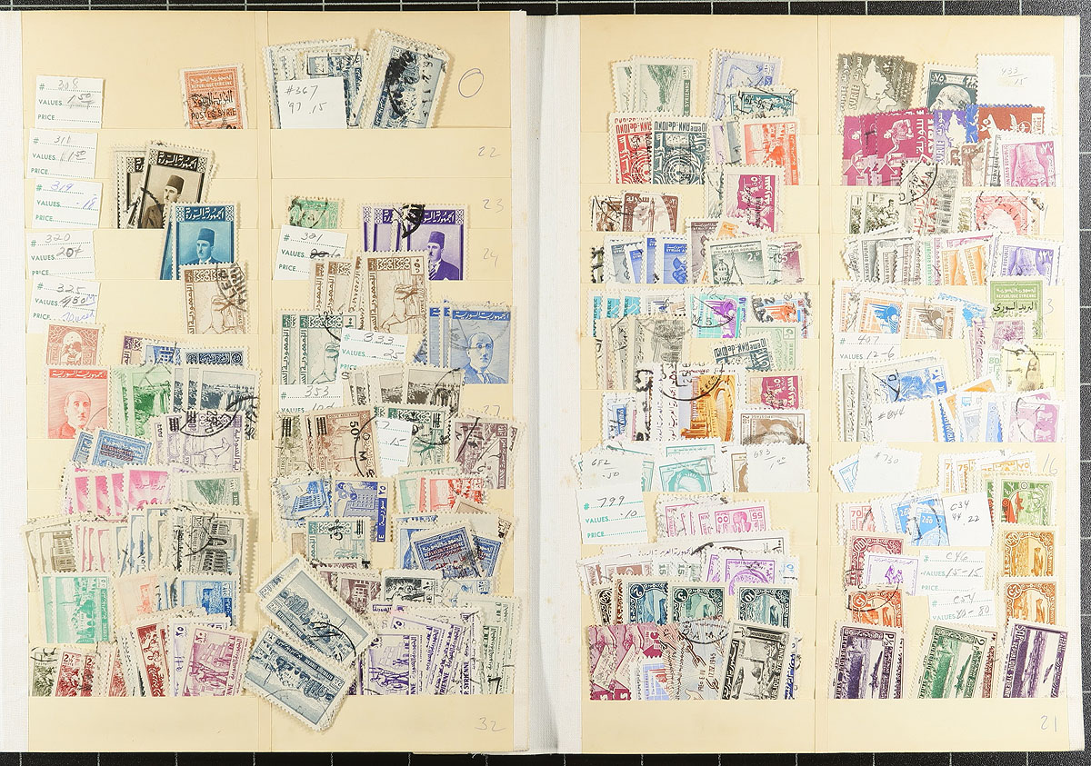 A box of legal sized envelopes and a few "Elbe" stockpages with a lightly sorted used holding, including envelopes with "TLO", "OMF" or "Syrie" overprints on French stamps. Afterwards there is a rough sorting of regular issues from back of the book in several envelopes, right into the 1980’s (there is an envelope with some mint circa 1996). Can’t remember the last time that we offered a large study lot of Syria. Thousands of stamps here. Estimate =