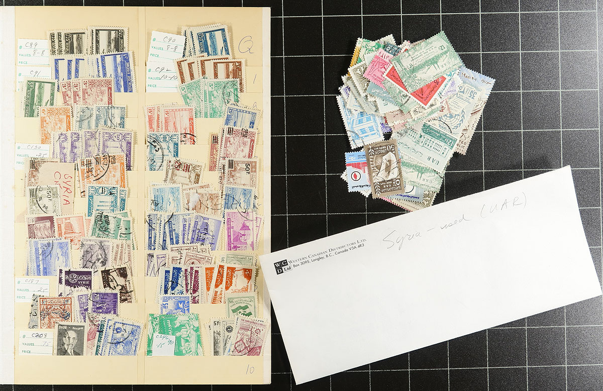 A box of legal sized envelopes and a few "Elbe" stockpages with a lightly sorted used holding, including envelopes with "TLO", "OMF" or "Syrie" overprints on French stamps. Afterwards there is a rough sorting of regular issues from back of the book in several envelopes, right into the 1980’s (there is an envelope with some mint circa 1996). Can’t remember the last time that we offered a large study lot of Syria. Thousands of stamps here. Estimate =