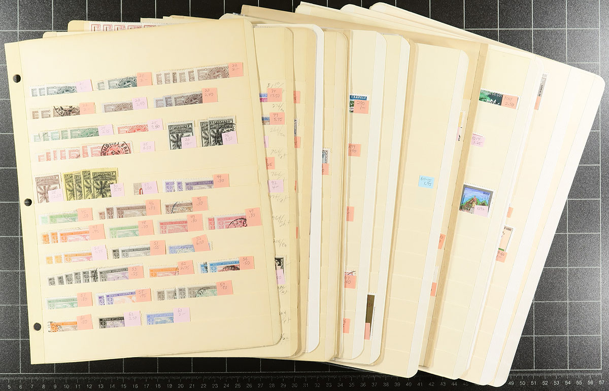 Unusual mint and used accumulation on 18 manila stockpages, one collector’s duplicate holding. Hit or miss coverage from the French colonial period, through independence and issues into about 1990. Singles, sets, overprints, and a good selection from the back of the book. Individual stamps have catalogue values up to $10.00, most in quantities of 1-5 stamps, but some have multiples with up to 50 copies (e.g. sheetlets of #611-615. Groupings for this African country don’t come around very often. Estimate =