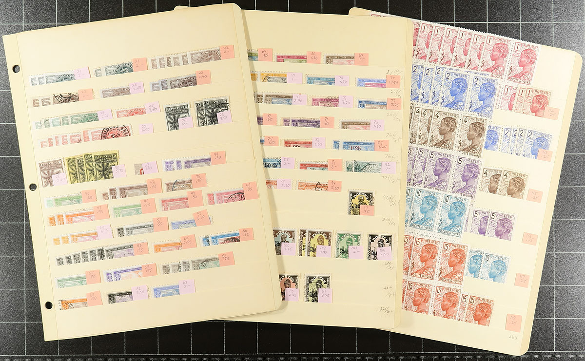 Unusual mint and used accumulation on 18 manila stockpages, one collector’s duplicate holding. Hit or miss coverage from the French colonial period, through independence and issues into about 1990. Singles, sets, overprints, and a good selection from the back of the book. Individual stamps have catalogue values up to $10.00, most in quantities of 1-5 stamps, but some have multiples with up to 50 copies (e.g. sheetlets of #611-615. Groupings for this African country don’t come around very often. Estimate =