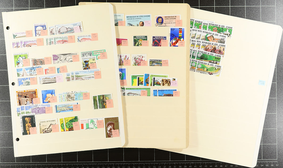 Unusual mint and used accumulation on 18 manila stockpages, one collector’s duplicate holding. Hit or miss coverage from the French colonial period, through independence and issues into about 1990. Singles, sets, overprints, and a good selection from the back of the book. Individual stamps have catalogue values up to $10.00, most in quantities of 1-5 stamps, but some have multiples with up to 50 copies (e.g. sheetlets of #611-615. Groupings for this African country don’t come around very often. Estimate =