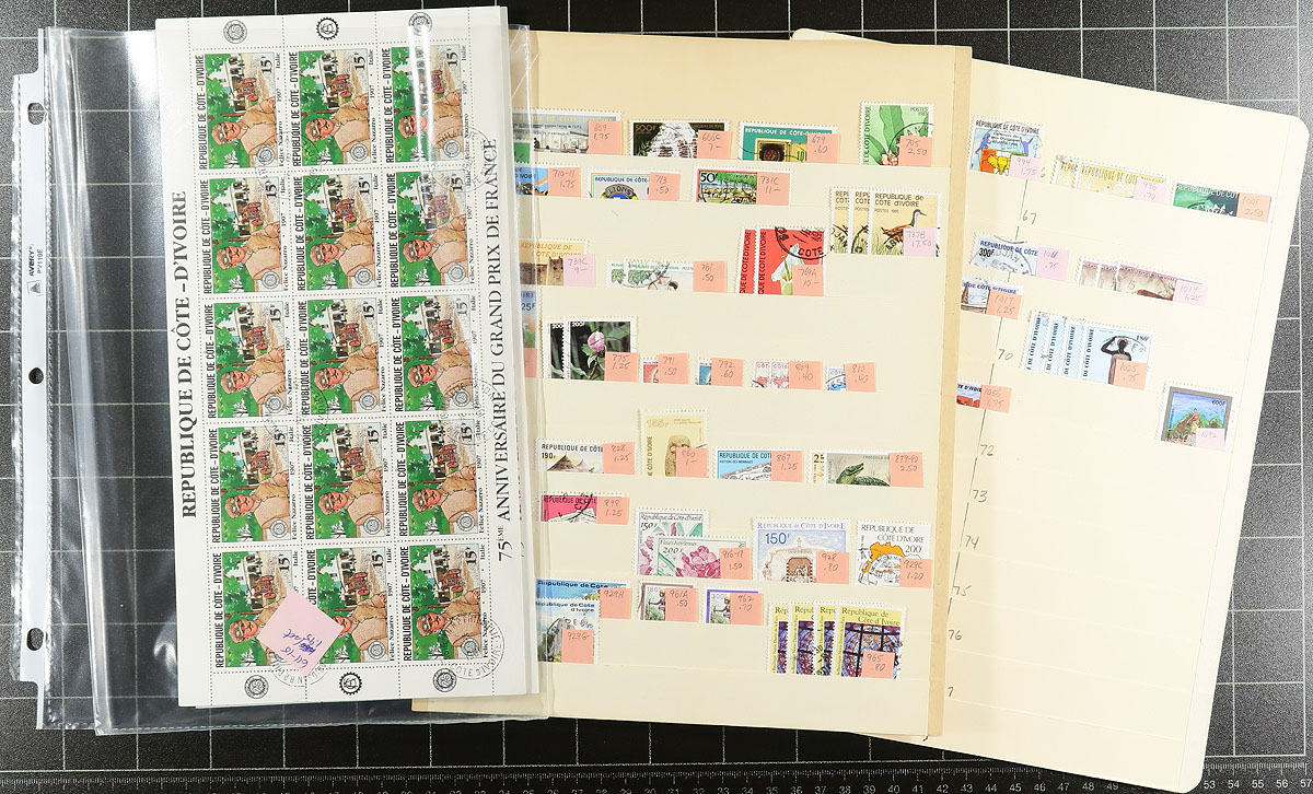 Unusual mint and used accumulation on 18 manila stockpages, one collector’s duplicate holding. Hit or miss coverage from the French colonial period, through independence and issues into about 1990. Singles, sets, overprints, and a good selection from the back of the book. Individual stamps have catalogue values up to $10.00, most in quantities of 1-5 stamps, but some have multiples with up to 50 copies (e.g. sheetlets of #611-615. Groupings for this African country don’t come around very often. Estimate =