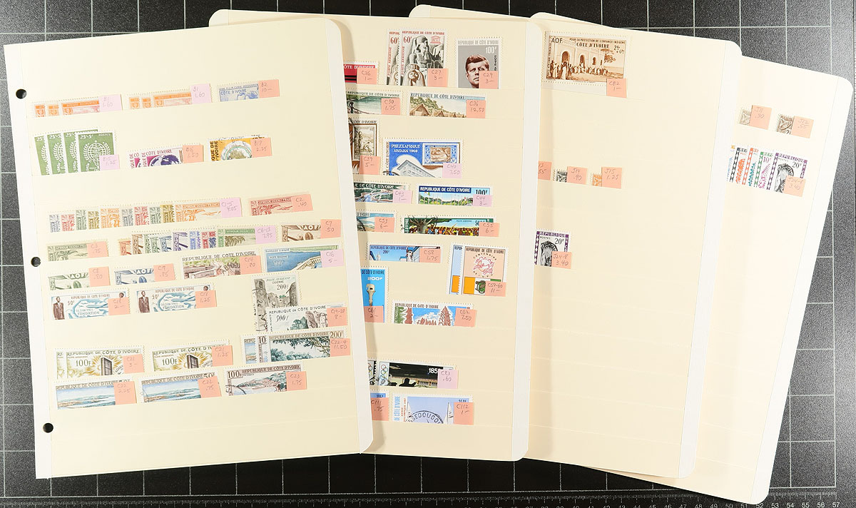 Unusual mint and used accumulation on 18 manila stockpages, one collector’s duplicate holding. Hit or miss coverage from the French colonial period, through independence and issues into about 1990. Singles, sets, overprints, and a good selection from the back of the book. Individual stamps have catalogue values up to $10.00, most in quantities of 1-5 stamps, but some have multiples with up to 50 copies (e.g. sheetlets of #611-615. Groupings for this African country don’t come around very often. Estimate =