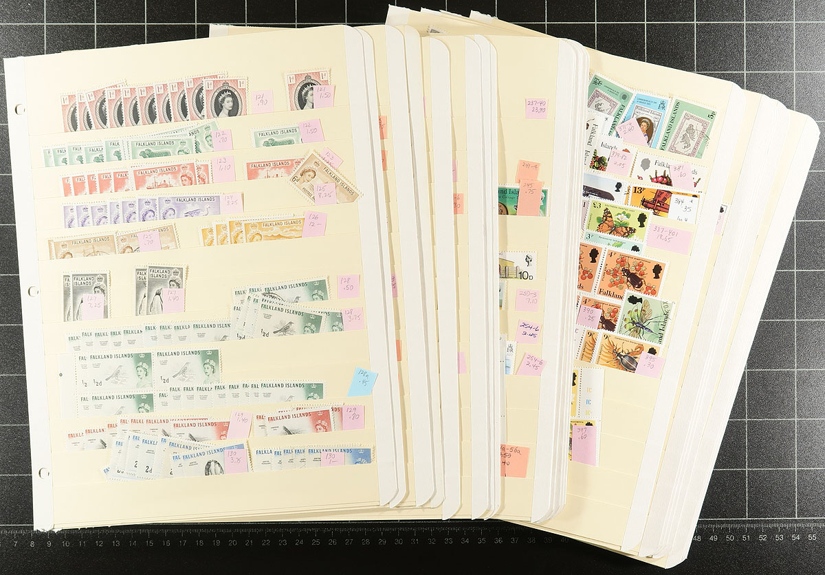 A substantial holding of material issued during the reign of Queen Elizabeth II (up to 2015), a mix of mint and used, with quantities of up to 20 of a type. A couple of the early sets are "short", including the birds, and by the 1960’s there are lots of common design issues, plus lengthy runs of definitives, and some better commemorative sets and singles with substantial topical appeal. Some notable more recent material includes #237-40, #254a-256a, #387-401, #840. Lots of items with catalogue values up to $10.00 each. 23 manila stockpages with over 1500 stamps. Estimate =
