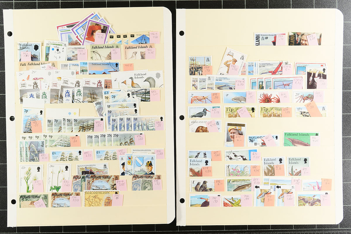 A substantial holding of material issued during the reign of Queen Elizabeth II (up to 2015), a mix of mint and used, with quantities of up to 20 of a type. A couple of the early sets are "short", including the birds, and by the 1960’s there are lots of common design issues, plus lengthy runs of definitives, and some better commemorative sets and singles with substantial topical appeal. Some notable more recent material includes #237-40, #254a-256a, #387-401, #840. Lots of items with catalogue values up to $10.00 each. 23 manila stockpages with over 1500 stamps. Estimate =