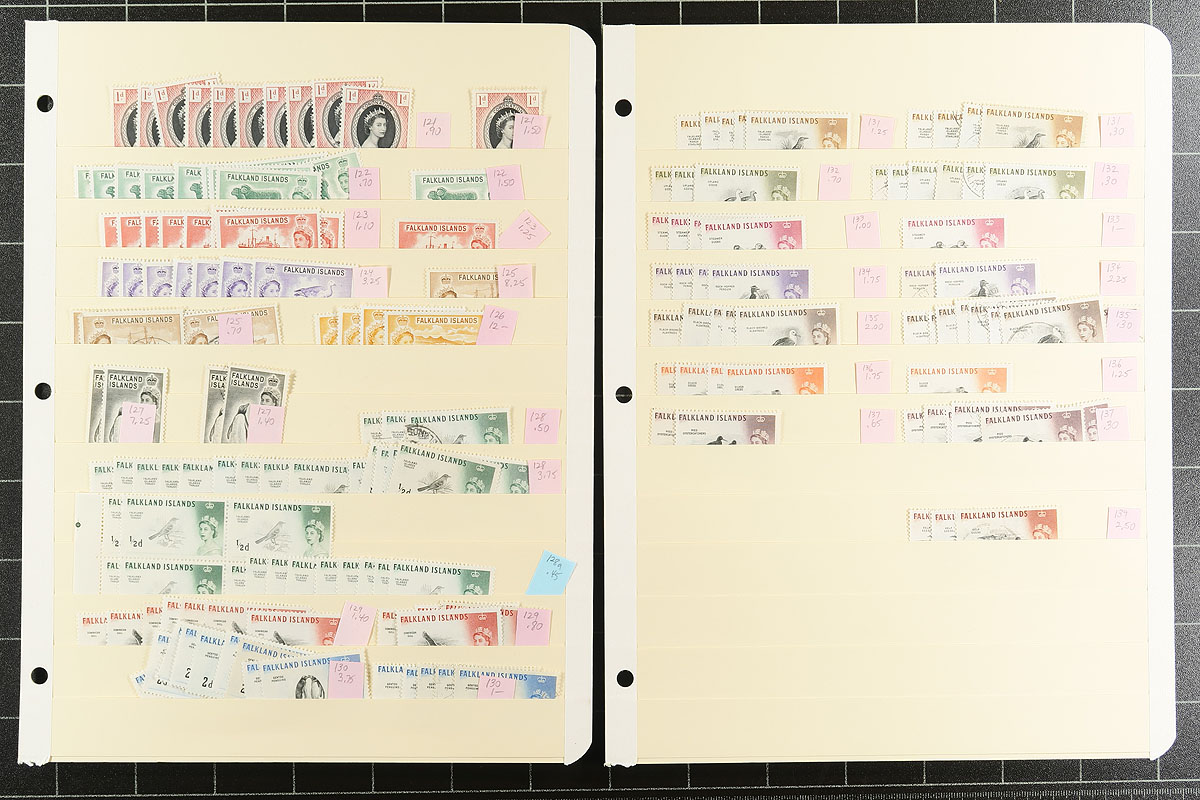 A substantial holding of material issued during the reign of Queen Elizabeth II (up to 2015), a mix of mint and used, with quantities of up to 20 of a type. A couple of the early sets are "short", including the birds, and by the 1960’s there are lots of common design issues, plus lengthy runs of definitives, and some better commemorative sets and singles with substantial topical appeal. Some notable more recent material includes #237-40, #254a-256a, #387-401, #840. Lots of items with catalogue values up to $10.00 each. 23 manila stockpages with over 1500 stamps. Estimate =