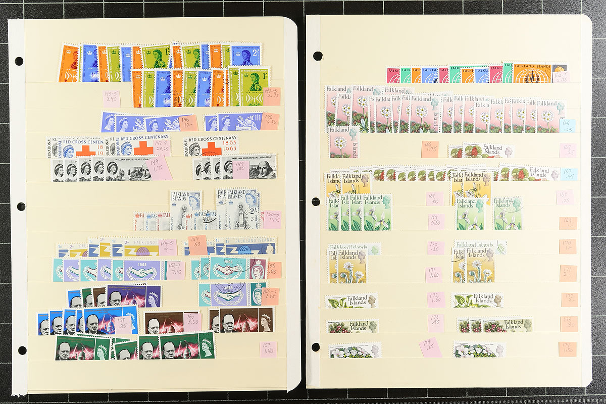 A substantial holding of material issued during the reign of Queen Elizabeth II (up to 2015), a mix of mint and used, with quantities of up to 20 of a type. A couple of the early sets are "short", including the birds, and by the 1960’s there are lots of common design issues, plus lengthy runs of definitives, and some better commemorative sets and singles with substantial topical appeal. Some notable more recent material includes #237-40, #254a-256a, #387-401, #840. Lots of items with catalogue values up to $10.00 each. 23 manila stockpages with over 1500 stamps. Estimate =