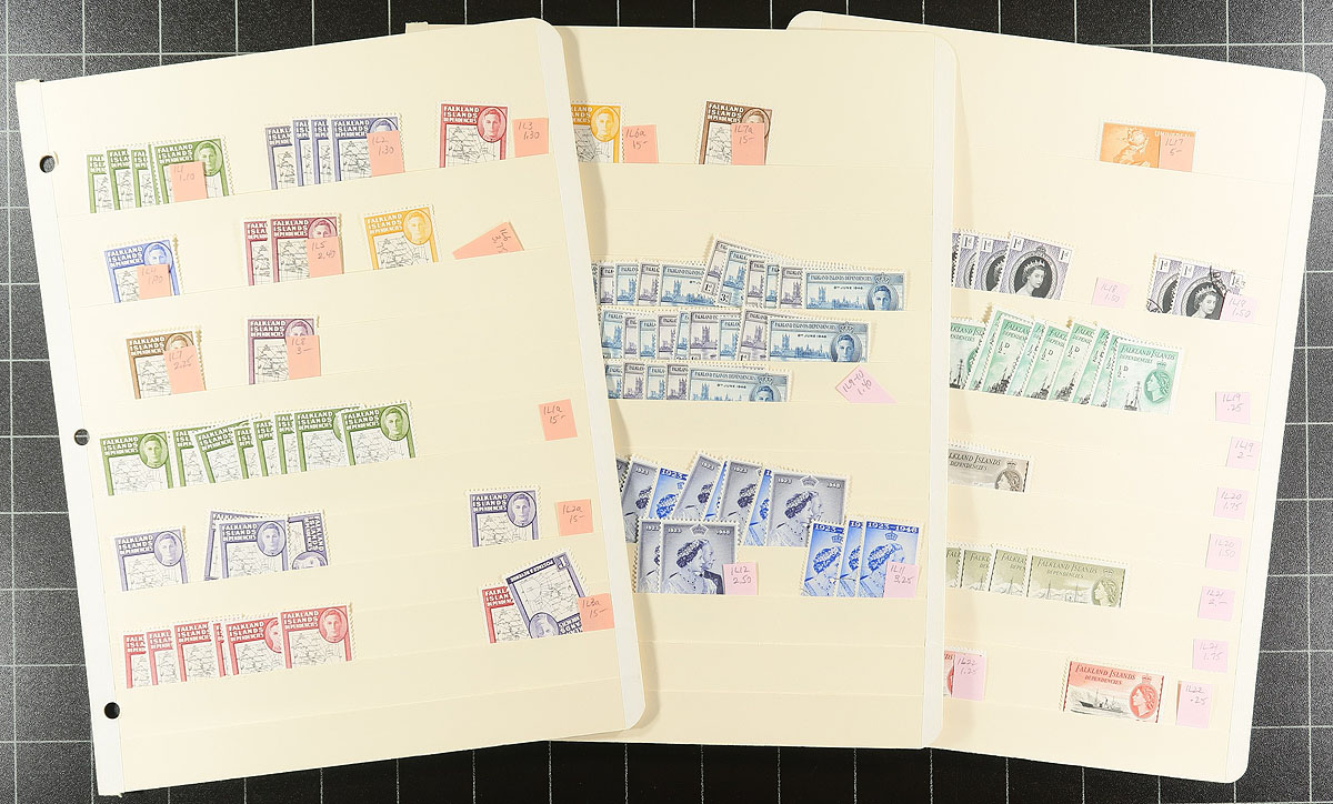 British Atlantic accumulation of mostly mint issues, neatly sorted on manila stockpages with stamps individually identified by Scott and somewhat current catalogue prices. The largest component is eight pages of Falkland Islands Dependencies, with the King George VI "Map" issue, including a number of examples of the "thin" or "light" printings. Lots of 1948 Silver Wedding, a couple of examples of #IL94 with inverted watermark. South Georgia, mostly to 1980 has some of the first series, plus some overprints for decimal currency (#21b x 7, #23b x6, #30a x7 mint) on six pages. The lot concludes with three pages of almost entirely mint British Antarctic Territory (#11, #34). Substantial catalogue value. Estimate =