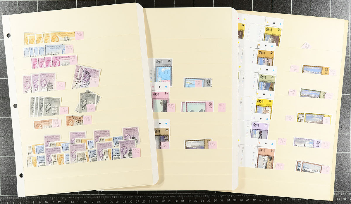 British Atlantic accumulation of mostly mint issues, neatly sorted on manila stockpages with stamps individually identified by Scott and somewhat current catalogue prices. The largest component is eight pages of Falkland Islands Dependencies, with the King George VI "Map" issue, including a number of examples of the "thin" or "light" printings. Lots of 1948 Silver Wedding, a couple of examples of #IL94 with inverted watermark. South Georgia, mostly to 1980 has some of the first series, plus some overprints for decimal currency (#21b x 7, #23b x6, #30a x7 mint) on six pages. The lot concludes with three pages of almost entirely mint British Antarctic Territory (#11, #34). Substantial catalogue value. Estimate =