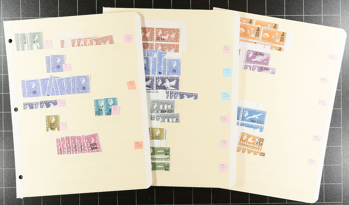 British Atlantic accumulation of mostly mint issues, neatly sorted on manila stockpages with stamps individually identified by Scott and somewhat current catalogue prices. The largest component is eight pages of Falkland Islands Dependencies, with the King George VI "Map" issue, including a number of examples of the "thin" or "light" printings. Lots of 1948 Silver Wedding, a couple of examples of #IL94 with inverted watermark. South Georgia, mostly to 1980 has some of the first series, plus some overprints for decimal currency (#21b x 7, #23b x6, #30a x7 mint) on six pages. The lot concludes with three pages of almost entirely mint British Antarctic Territory (#11, #34). Substantial catalogue value. Estimate =