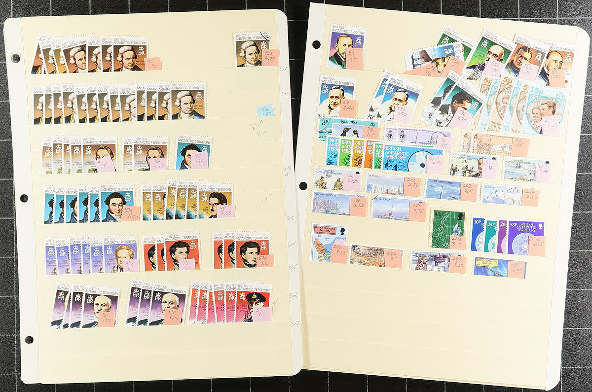 British Atlantic accumulation of mostly mint issues, neatly sorted on manila stockpages with stamps individually identified by Scott and somewhat current catalogue prices. The largest component is eight pages of Falkland Islands Dependencies, with the King George VI "Map" issue, including a number of examples of the "thin" or "light" printings. Lots of 1948 Silver Wedding, a couple of examples of #IL94 with inverted watermark. South Georgia, mostly to 1980 has some of the first series, plus some overprints for decimal currency (#21b x 7, #23b x6, #30a x7 mint) on six pages. The lot concludes with three pages of almost entirely mint British Antarctic Territory (#11, #34). Substantial catalogue value. Estimate =