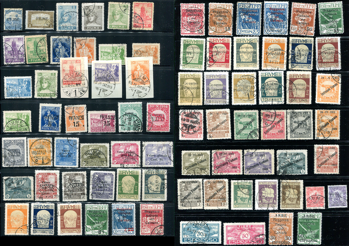 Two pages of used Fiume issues (a couple on piece), with some revalued, a number of overprints celebrating annexations, finishing with a small group of very good semi-postals and special delivery issues. The highlights are #145, #E-4, #E7. A couple small perf faults were seen. Keep a close eye on the cancels from this time period. 2024 Scott US$802.70 =