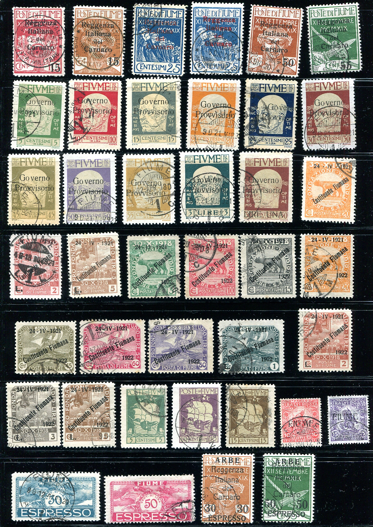 Two pages of used Fiume issues (a couple on piece), with some revalued, a number of overprints celebrating annexations, finishing with a small group of very good semi-postals and special delivery issues. The highlights are #145, #E-4, #E7. A couple small perf faults were seen. Keep a close eye on the cancels from this time period. 2024 Scott US$802.70 =