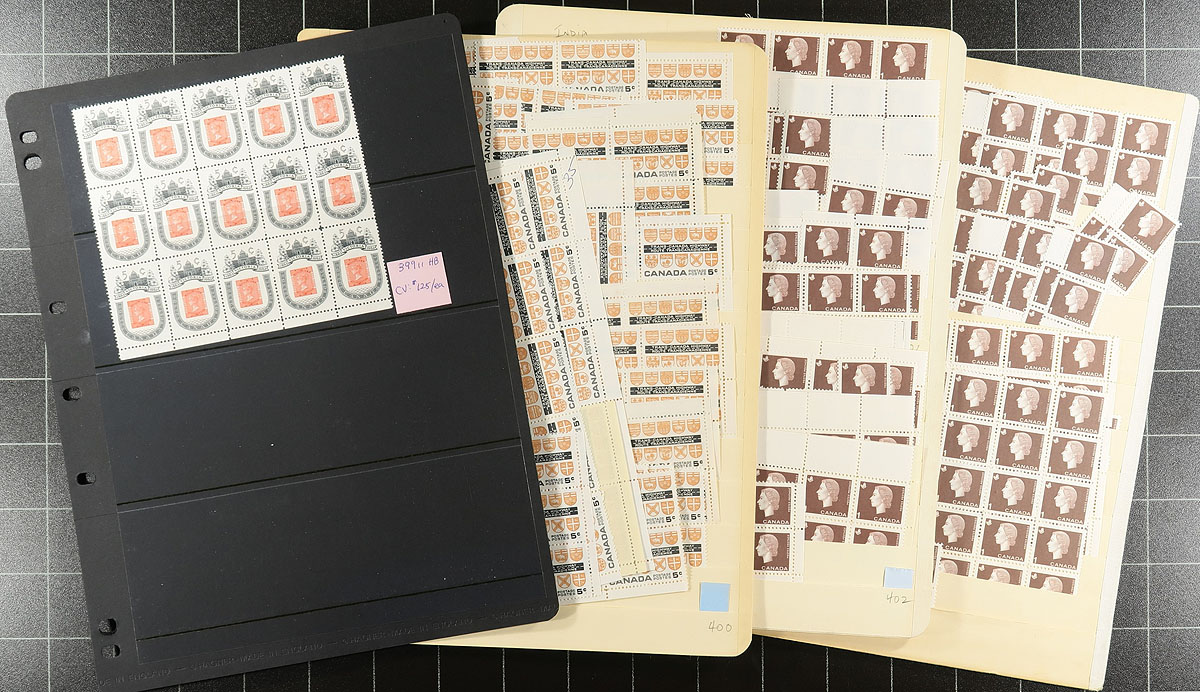 Volume 6 - Mint Canada wholesale stock (#343/409). This volume is from the Gannet to the Cameo coils Generally, one issue per stockpage. Anywhere from 20 to a couple of hundred stamps per page. Lots of multiples with relatively few plate blocks. A quick check indicates that most, if not all, are never hinged. From the 5c era, we noted Prime Ministers, animals, Chemical industry, Pulp and Paper, "Outdoor" sports, UPU. Enormous catalogue value. Conservative face value =