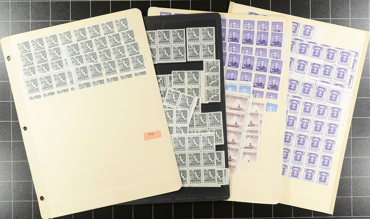 Volume 6 - Mint Canada wholesale stock (#343/409). This volume is from the Gannet to the Cameo coils Generally, one issue per stockpage. Anywhere from 20 to a couple of hundred stamps per page. Lots of multiples with relatively few plate blocks. A quick check indicates that most, if not all, are never hinged. From the 5c era, we noted Prime Ministers, animals, Chemical industry, Pulp and Paper, "Outdoor" sports, UPU. Enormous catalogue value. Conservative face value =