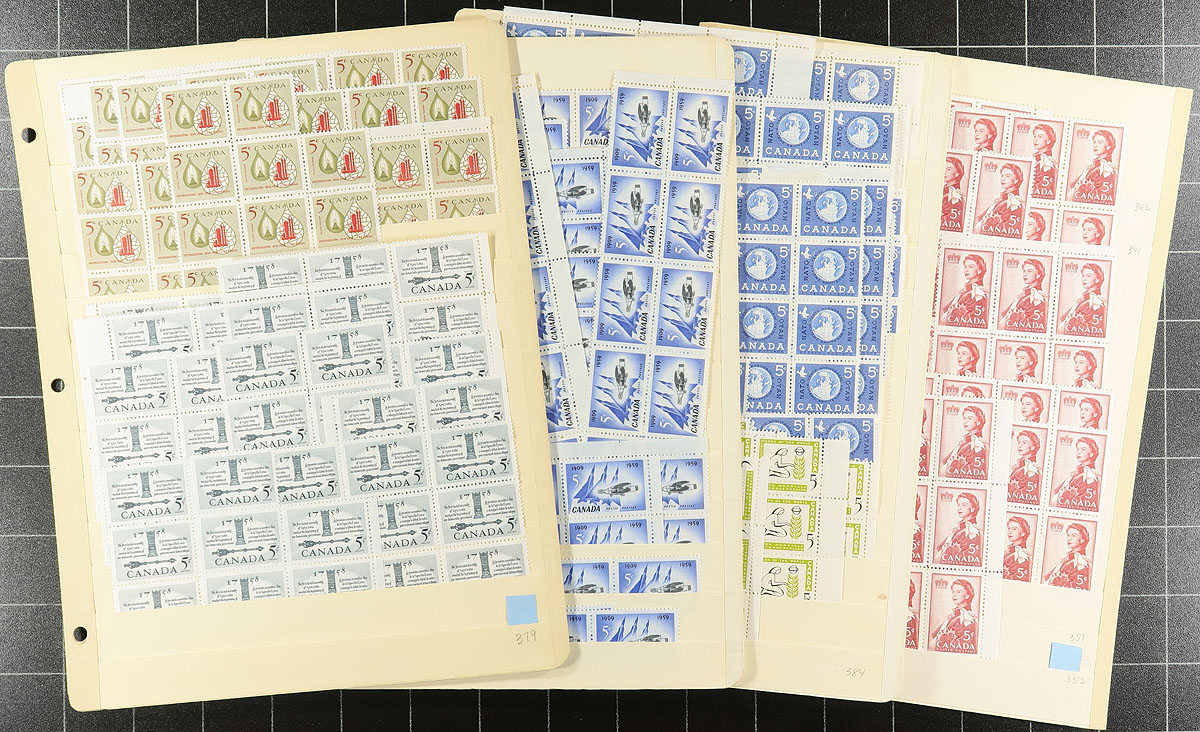 Volume 6 - Mint Canada wholesale stock (#343/409). This volume is from the Gannet to the Cameo coils Generally, one issue per stockpage. Anywhere from 20 to a couple of hundred stamps per page. Lots of multiples with relatively few plate blocks. A quick check indicates that most, if not all, are never hinged. From the 5c era, we noted Prime Ministers, animals, Chemical industry, Pulp and Paper, "Outdoor" sports, UPU. Enormous catalogue value. Conservative face value =