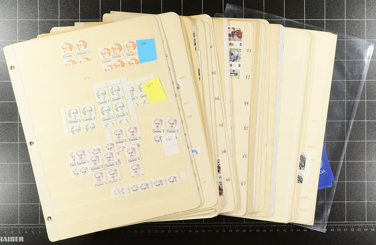 Volume 7 - Mint Canada wholesale stock (#586/694). This volume is from the QEII Caricature to the 20c "Archer". Generally, one issue per stockpage. Anywhere from 10 to a couple hundred stamps per page. Lots of multiples with relatively few plate blocks. A quick check indicates that most, if not all, are never hinged. From the mid-1970s, with over 100 of the $1 Vancouver (#600), and quantities of the Montreal Olympics $1 and $2 Sculptors and Buildings. A late bonus is 8 plate blocks of the 1982 $2 Commonwealth Day. Enormous catalogue value here. Conservative face value =