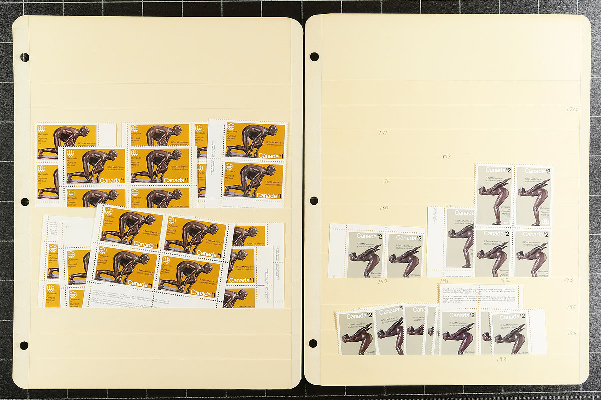 Volume 7 - Mint Canada wholesale stock (#586/694). This volume is from the QEII Caricature to the 20c "Archer". Generally, one issue per stockpage. Anywhere from 10 to a couple hundred stamps per page. Lots of multiples with relatively few plate blocks. A quick check indicates that most, if not all, are never hinged. From the mid-1970s, with over 100 of the $1 Vancouver (#600), and quantities of the Montreal Olympics $1 and $2 Sculptors and Buildings. A late bonus is 8 plate blocks of the 1982 $2 Commonwealth Day. Enormous catalogue value here. Conservative face value =